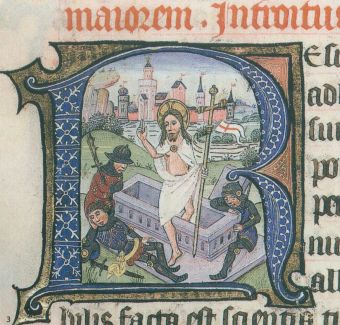Ik denk dat de middeleeuwse miniaturist zelf verbaasd zou zijn als hij kon zien hoe gaaf zijn plaatjes ook na tien keer uitvergroten zijn. Het Paasverhaal toont een Christusfiguur, die met een Lijdensdoek in de hand uit zijn geopende graf stapt. Drie romeinse wachters liggen lekker te slapen in het lentelandschap en hebben niets in de gaten. Een paar plaatjes verder verschijnt Maria Magdalena in een versierd initiaal. Het Brugs missaal werd in opdracht van het Maria Magdalena Gilde gemaakt en dus is zij - de mooiste aller heiligen - er met haar lange, blonde haren ook lieftallig in afgebeeld. Maria Magdalena (Myrrhophore = de zalfdragende) komt met haar luxe zalfpot naar het graf om het Lichaam van Christus te balsemen maar ontdekt bij het lege graf de engel, die haar het verheugende nieuws vertelt: Christus is verrezen! De vreugde straalt van dit Paasverhaal af.