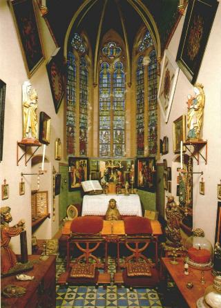 De gegevens bij de ruim zestig religieuze beelden zijn summier; naar maar dat doet niets af aan hun betekenis. Ze zijn versleten onder de devotie van eeuwen. De vele Madonna's zijn afkomstig uit de Noordelijke-of Zuidelijke Nederlanden, Duitsland, Italië, Spanje en Frankrijk. Een 15de eeuwse tronende Maria die in de loop der eeuwen wel het Kind op haar schoot heeft verloren maar niets van haar gratie, kijkt tamelijk streng. Een Duitse Madonna uit de 16de eeuw houdt Jezus zwierig op haar arm en werpt ons een uitgesproken liefelijke blik toe. De H. Catharina, de H. Helena en de H. Jacobus hanteren fier hun attributen: martelwerktuigen in de vorm van rad, zwaard of knuppel. Van stevige bouw is de stenen St. Isidoor uit de 15de eeuw die in de school van de Bourgondische meester Claus Sluter gemaakt zou zijn. Deze Spaanse patroonheilige van de vrome landman is duidelijk van nederige afkomst en leunt op een schop.