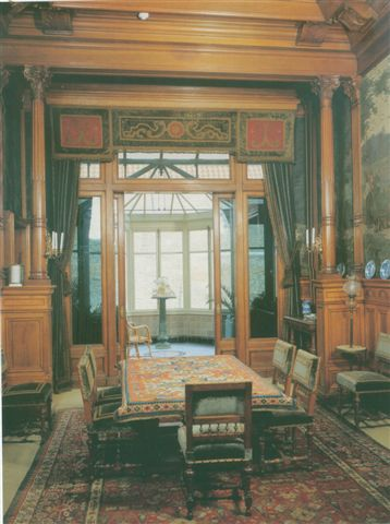 We kunnen ons goed voorstellen hoe Meester van Gijn en zijn vrouw hun gasten door deze gang naar hun eetkamer leidden, waar de gedekte tafel stond met uitzicht op de schaduwrijke stadstuin. Het was een der vertrekken die architect Muysken in Hollandse renaissancestijl herschiep. Van Gijn was er zo trots op dat hij bepaalde, dat niets aan dit vertrek na zijn dood veranderd mocht worden. Boven de hoge, eikenhouten lambrisering liet hij Willy Martens (1856-1927) wandschilderingen aanbrengen. Martens, die op Java was geboren en in Parijs leerling werd van Bonnat, slaagde er wonderwel in een 'Germaans heuvellandschap' te scheppen. Hij werkte in matte blauwe en groene tinten op een ondergrond van grof geweven linnen, waardoor het geheel aan een tapisserie doet denken. En dat was ook de bedoeling want in de Zaal, de voornaamste kamer van het huis, waren de wanden al in 1730 voorzien van een serie wondermooie wandtapijten. Ze zijn speciaal voor dit vertrek in Oudenaarde op maat geweven. Rondom zien we taferelen uit het populaire herdersspel Il pastor fido. Als antwoord op het Grieks arcadische thema vormt het 'Germaans heuvellandschap' in de eetkamer een harmonisch geheel. Waar in de Zaal de bevallige Amaryllis in het groen de hand reikt aan de herder Mirtillo, haalt in de eetkamer een gespierde Germaan de visnetten op, hoedt een ander zijn schapen en wordt een wild zwijn prooi van de stoere jager.