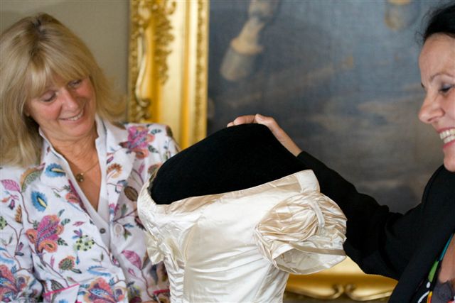 Daarna was het mijn beurt om iets te vertellen over de prachtige japon van groothertogin Sophie (1824-1897), die Cornelie me in 2009 bij een bezoek in Duitsland schonk. Al die jaren vormde de witsatijnen japon - waarvan de baleinen in het lijfje nog de zweetdroppeltjes van een hofbal leken te dragen - een bron van inspiratie voor me. Tijdens het schrijven van mijn biografie over Sophie was het of haar fantoom versierd met strikken en linten over de rugleuning van de bank lag uitgespreid. Maar nu wil ik dat anderen kunnen delen in het bekijken van de historische japon van een uitzonderlijke vrouw.