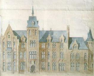 Savina en Charles van Caloen kozen de Brits roomse architect E.W. Pugin om hun kasteel te bouwen. Hij was een zoon van de vermaarde A.W. N. Pugin, die o.m. in Londen de Houses of Parliament schiep. Pugin begon met het graven van een grote vijver voor de Engelse landschapsstuin. Van de klei die de arbeiders uit de bodem schepten werden ter plaatse duizenden, zachtrode bakstenen gebakken en men begon met de aanleg van de funderingen. Spoedig ontstond er echter onenigheid tussen opdrachtgevers en ontwerper. Pugin legde het werk neer.