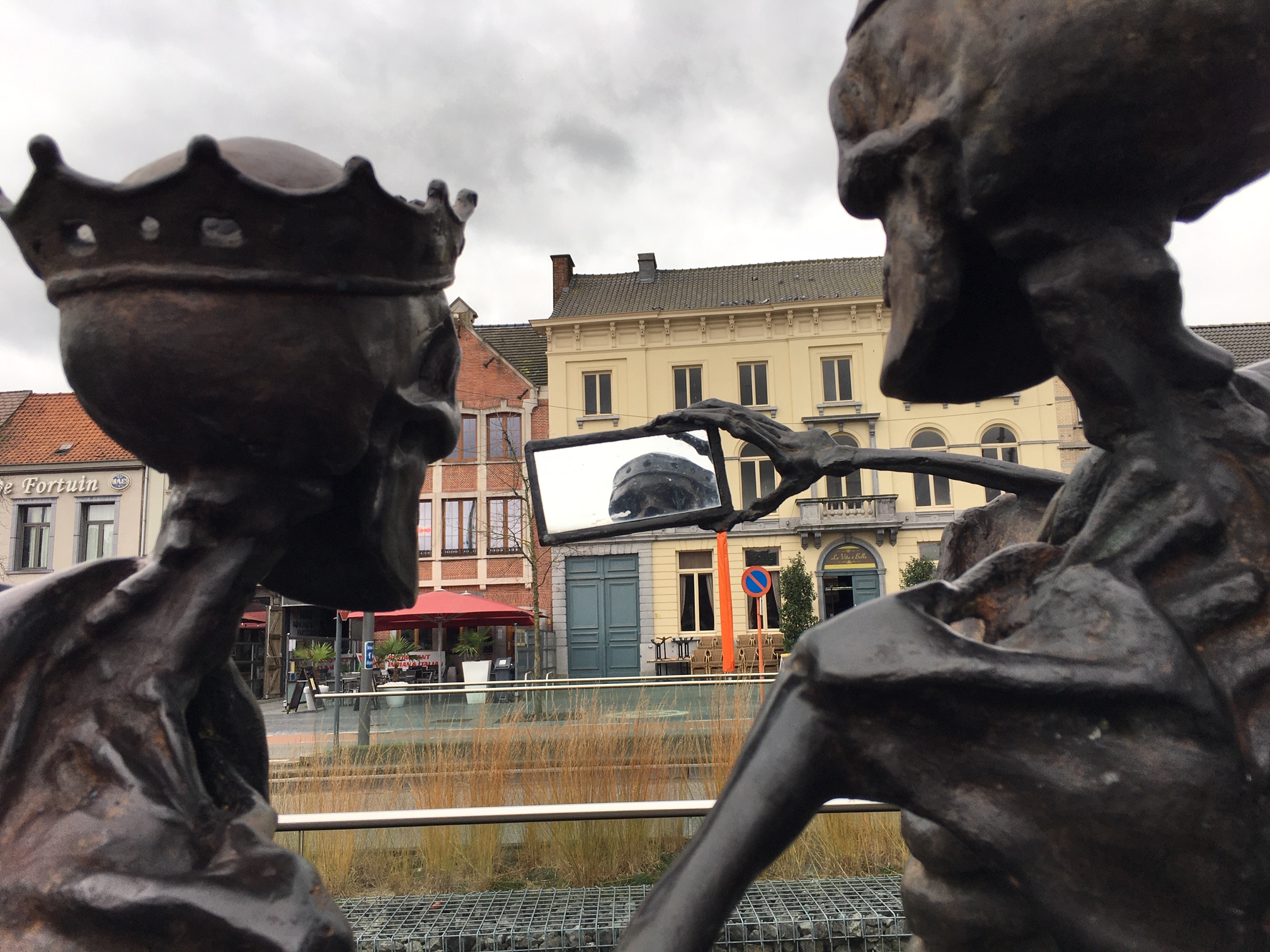 Sinds de verschijning van de dubbelbiografie heb ik overal lezingen gehouden. Totdat het coronavirus daar voorlopig een eind aan maakte. In de overvolle bibliotheekzaal van Sint-Niklaas - de stad die in de 13de eeuw van de gravinnen een stuk grond voor uitbreiding kreeg - gebeurde er iets bijzonders: daar stelde iemand zich voor als de beeldhouwer Frans Heirbaut, Hij bleek de maker van een bronzen beeld dat op de Markt staat en veel reacties van de voorbijgangers oproept. Johanna en Margaretha benadrukken daarin de sterfelijkheid van de mens, een geliefd thema in de hoge middeleeuwen, De zusters zijn uitgebeeld als elegante skeletten die zich amuseren met het maken van een hedendaagse selfie. Ze bekijken zichzelf in een spiegel, een bekend vanitas symbool dat hun ongeletterde tijdgenoten direct herkenden. De beeldhouwer kreeg in 2019 terecht de Cultuurprijs van Sint-Niklaas voor zijn schepping.