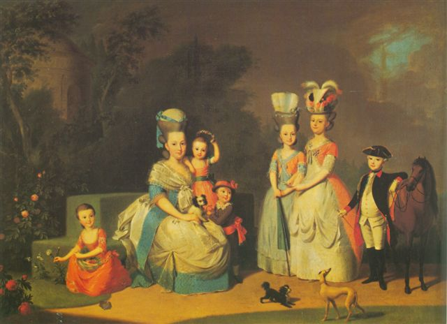 Schilderij van A. W. Tischbein met volgens Carolina (midden met kind op schoot) 'zeven apetronieën op een rij.' (Paleis Het Loo)