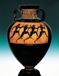 Rode figuurtjes van dansende Bachanten op een Griekse vaas.